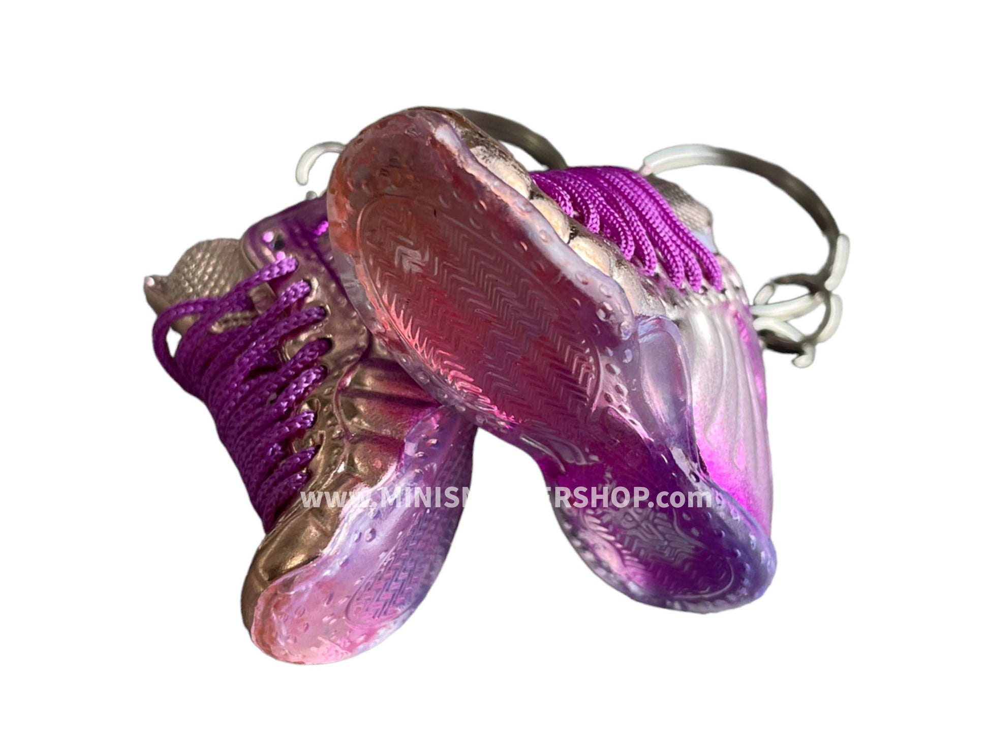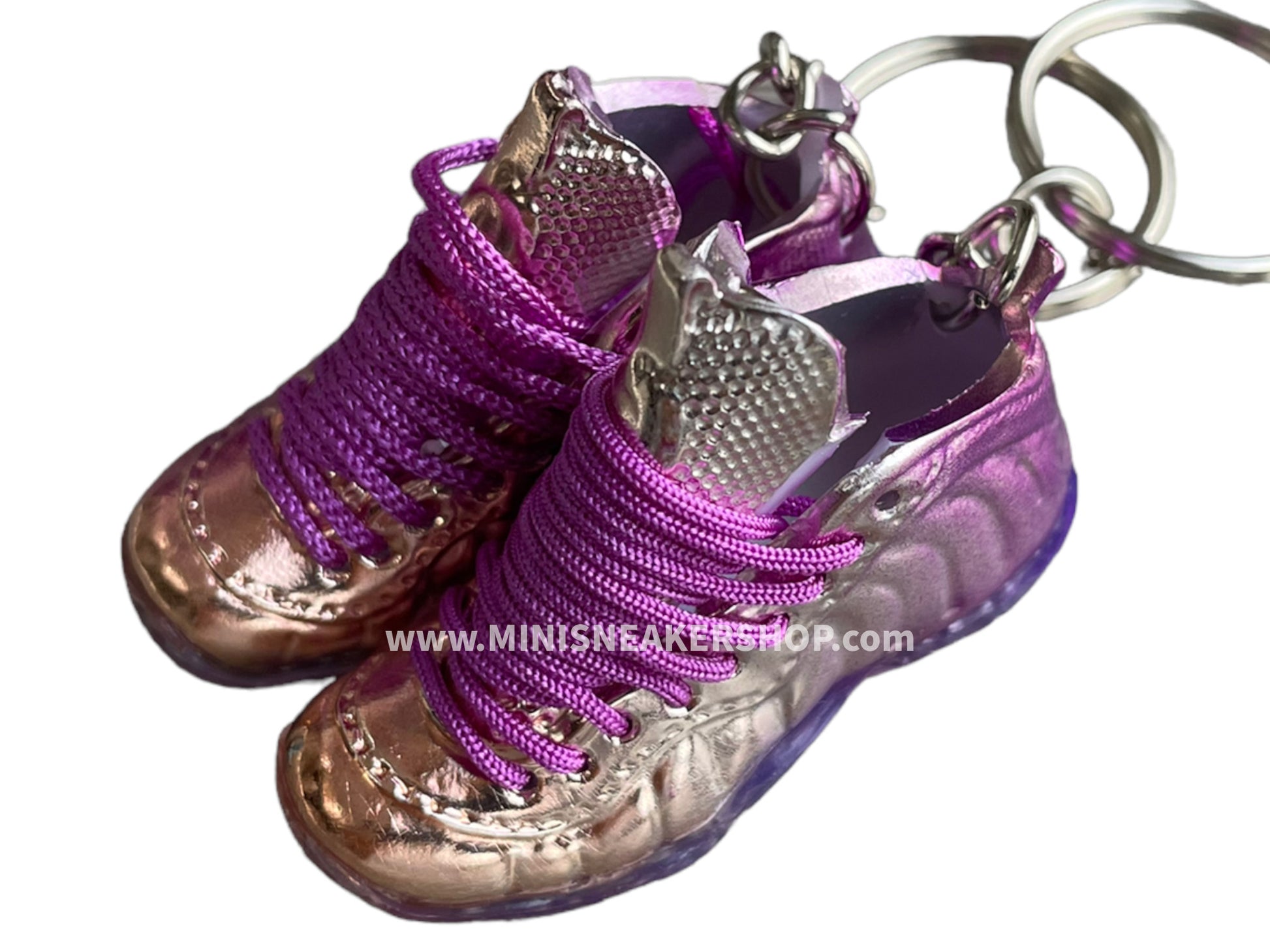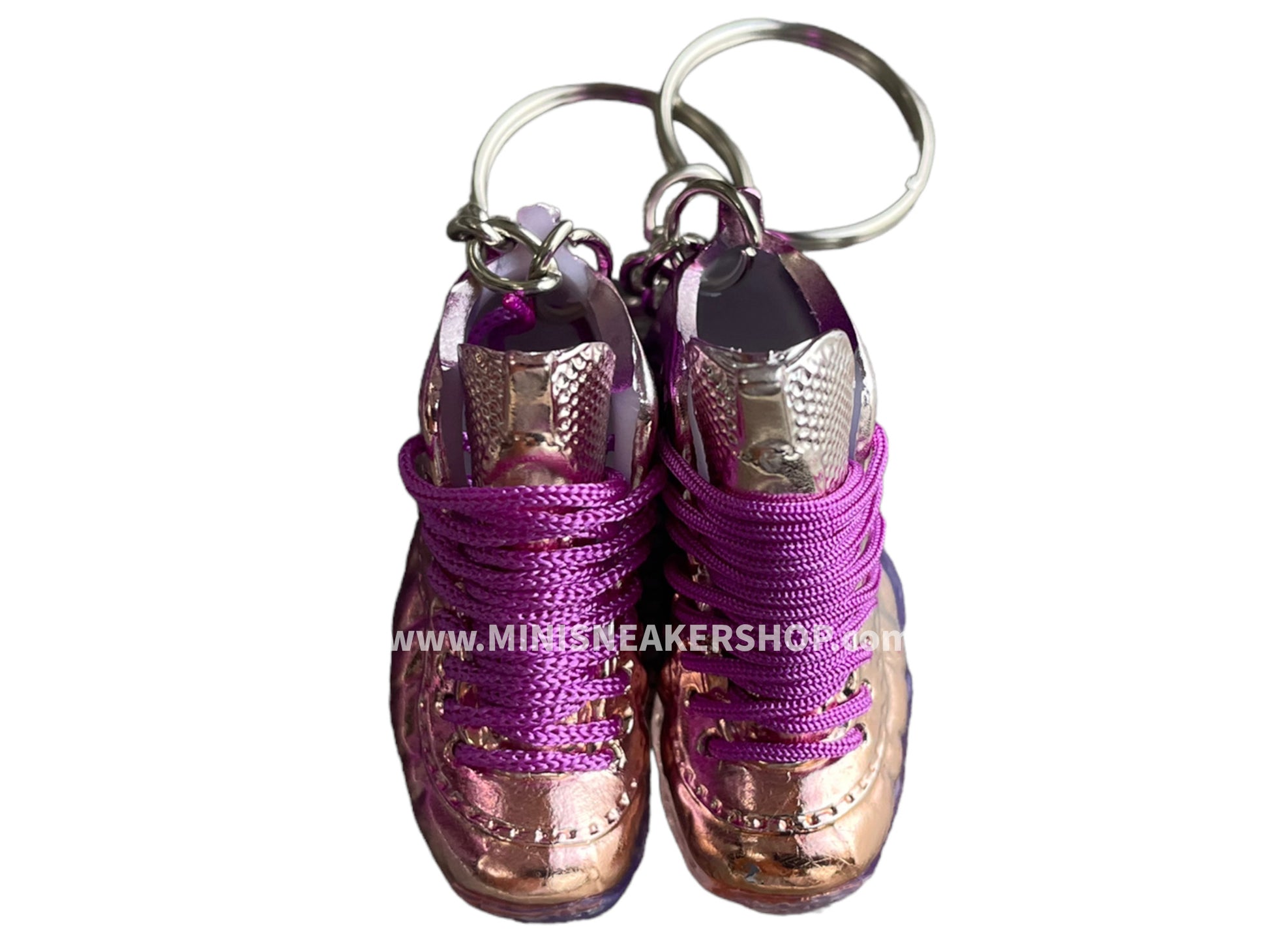 This is a pair of Mini sneaker keychain 3D Foamposite - Metallic Pink