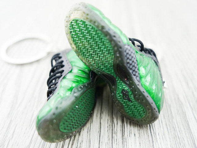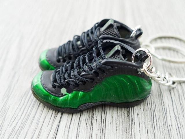 This is a pair of mini sneaker keychains 3D Foamposite Space Green
