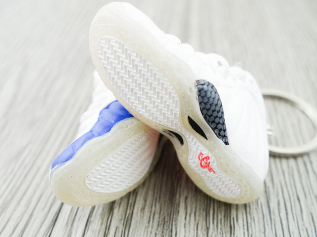 This is a pair of mini sneaker keychains 3D Foamposite White Blue/Coral